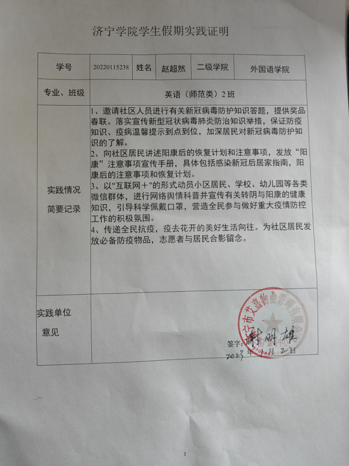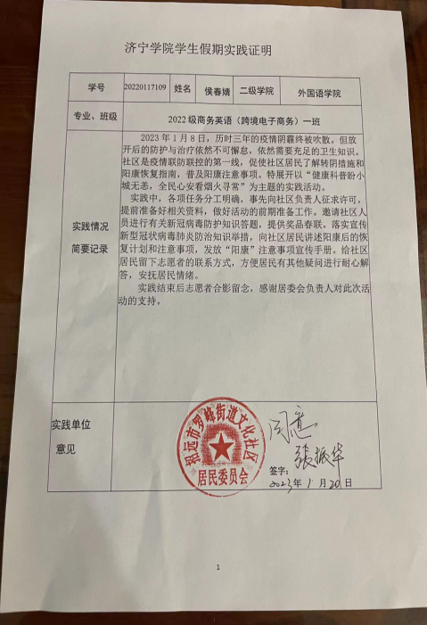 为进一步应对疫情,普及感染后的应对方法,快速“阳康”,提高群众医疗卫生认知水平,营造健康、积极的抗疫氛围,确保新年新气象,新氛围。外国语学院党员志愿服务队陈刚、侯春婧、赵超然、李阳共4人于2023年1月20日到2月18日在各自社区内联合发起了“健康科普盼小城无恙,全民心安看烟火寻常”系列主题文明实践活动,通过线上线下联动的形式,普及抗疫知识,传播防疫及阳康恢复等技巧,安抚居民情绪,减少对病毒的恐慌,有助于全民抗疫工作的进行。以实际行动为防疫工作尽一份力量,让抗疫走进群众,走进生活,践行了“健康中国”理念。