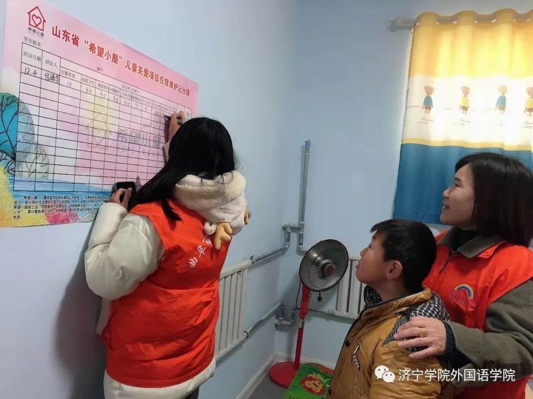 济宁学院外国语学院党员志愿服务队的志愿者们于12月4日采用入户回访的方式对希望小屋儿童以及希望小屋进行小屋验收。首先,早上志愿者们乘坐公交到曲阜市微爱超市集合,与彩虹公益社会志愿者会面,然后根据人数分成四组分别去四个不同的地方对第三批新建成的希望小屋进行走访,每个小组看望5名希望小屋儿童。在走访过程中将新被褥送到希望小屋儿童家中,拍下前后房屋对比照进行存档,并完成希望小屋儿童关爱项目日常维护打分,志愿者与希望小屋儿童家长和希望小屋儿童进行学习和生活上的交流,告诉孩子们要打扫小屋保持小屋整洁干净。一位大学生志愿者和一个小男孩交流说“你要好好收拾你的屋子和被子,努力学习,争取拿一个好成绩,下次我再来的时候给你打满分好不好!”孩子洋溢着天真无邪的笑容开心地一口应道:“好!”