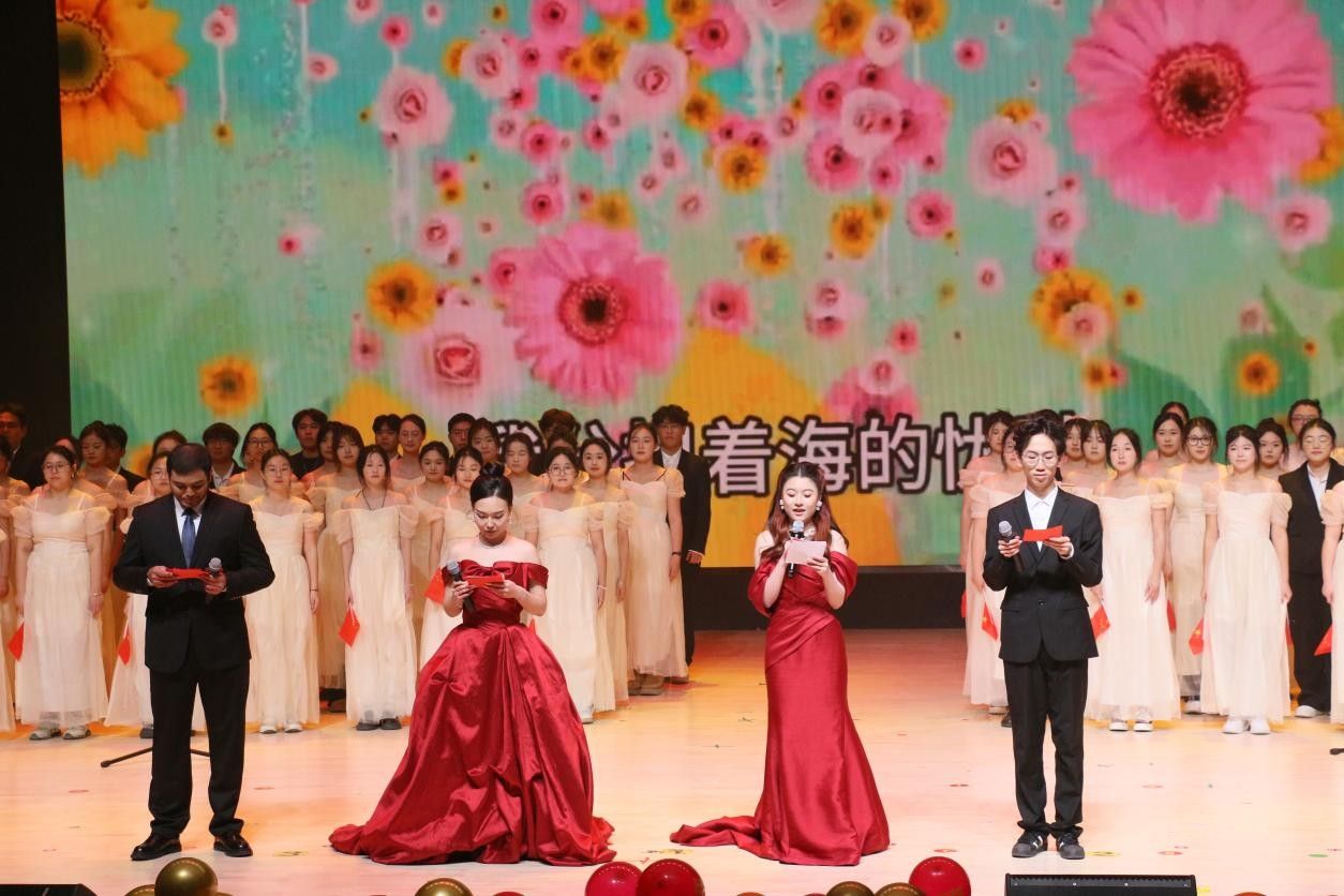节目展演环节亮点纷呈,中外学子同台献艺,用多元艺术形式演绎文化之美。开场舞《古扎丽古丽》由音乐学院23级舞蹈学女2班学子倾情演绎,灵动的舞姿拉开晚会序幕;紧接着,外国语学院学生与国际教育学院留学生携手带来的《论语传唱》,将儒家经典的智慧与韵味娓娓道来,让中华优秀传统文化在青年一代的演绎中焕发新生。室内乐《权力的游戏》奏响恢弘乐章,歌曲串烧则汇聚了中外学子的深情演唱,不同语言的歌声交织共鸣,展现了音乐无国界的魅力。