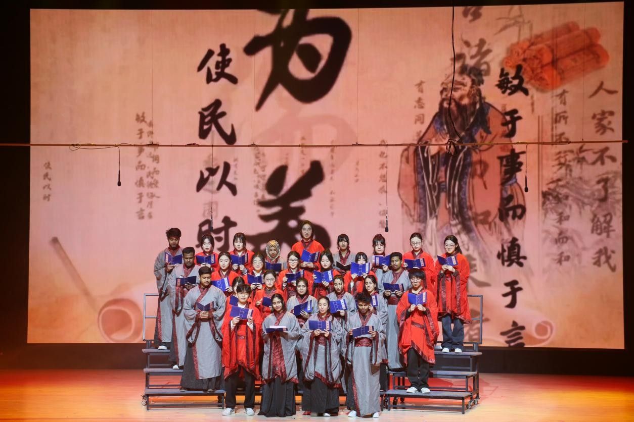 文化传播的脉络贯穿节目全程。女声小组唱《小城谣》曲风温婉,将中式古典意境展现得淋漓尽致;情景剧《与孔子跨越时空的对话》以创新形式再现儒家思想的精髓,让中外学子更直观地感受中华文脉的深厚底蕴。蒙古国留学生带来的蒙古舞,舞姿刚健洒脱,尽显草原民族的豪迈风情;来自非洲的留学生献上的非洲鼓表演,节奏明快、热情奔放,将非洲大陆的活力与激情传递给在场每一位观众,实现了异域文化与中华文化的双向奔赴。