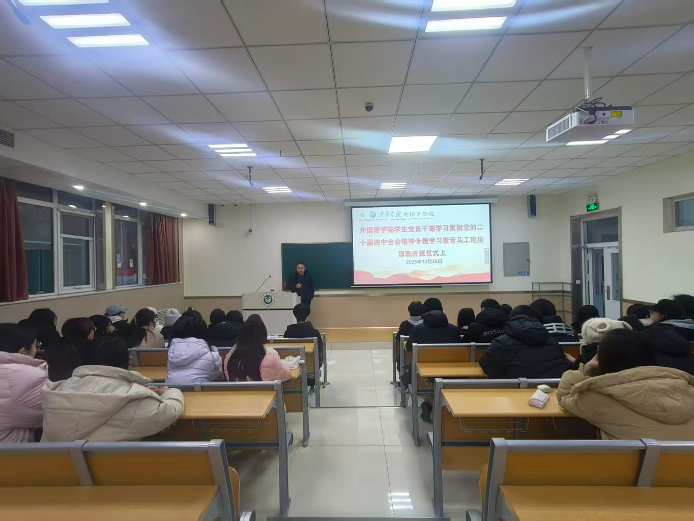 为深入学习贯彻习近平新时代中国特色社会主义思想,扎实推进青年马克思主义者培养工程,强化青年学子思想政治引领,锻造高素质外语青年骨干队伍,2025年12月16日,外国语学院青马工程培训班开班仪式在3C202教室隆重举行。学院党委书记陆波出席并主持仪式,本期青马工程全体学员参加本次仪式。