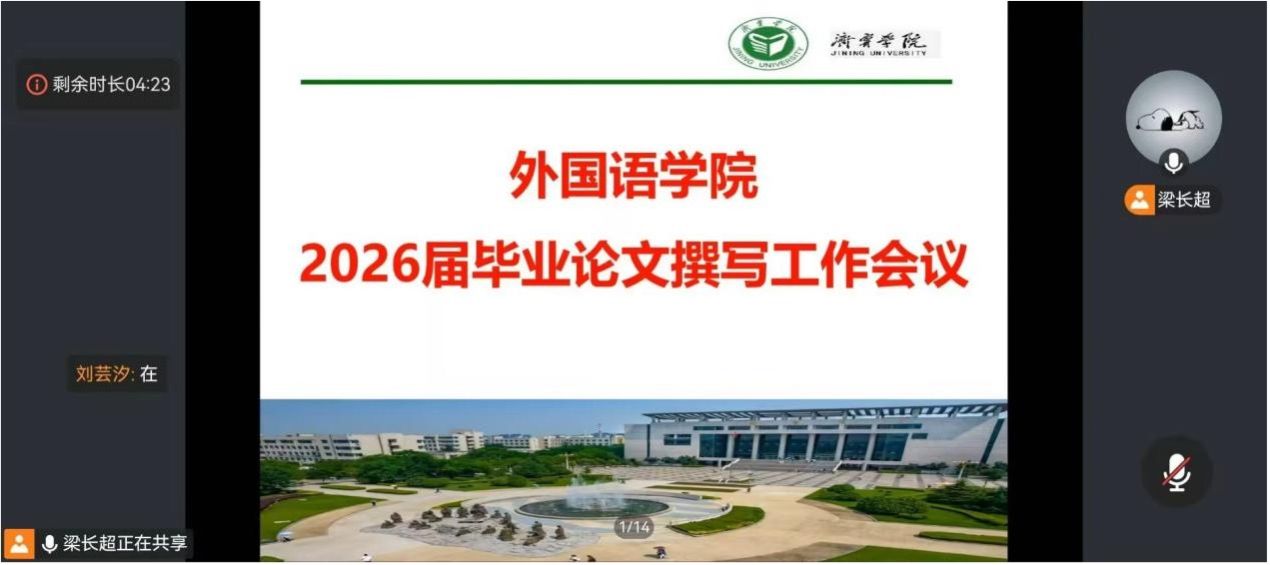 为扎实推进2026届本科毕业生论文指导工作,确保论文写作的规范性与高质量,外国语学院于11月13日下午召开2026届毕业论文工作启动与部署会议。会议由学院学术副院长范莉主持,教学秘书梁长超老师及全体毕业生参加会议。针对实习支教的学生,梁长超老师通过腾讯会议布置论文工作。